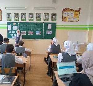 В рамках недели чеченского языка и литературы в 7 классе прошёл открытый урок по стихотворению Бисултанова А.Д. "Хьайбахахь язйина байташ ".