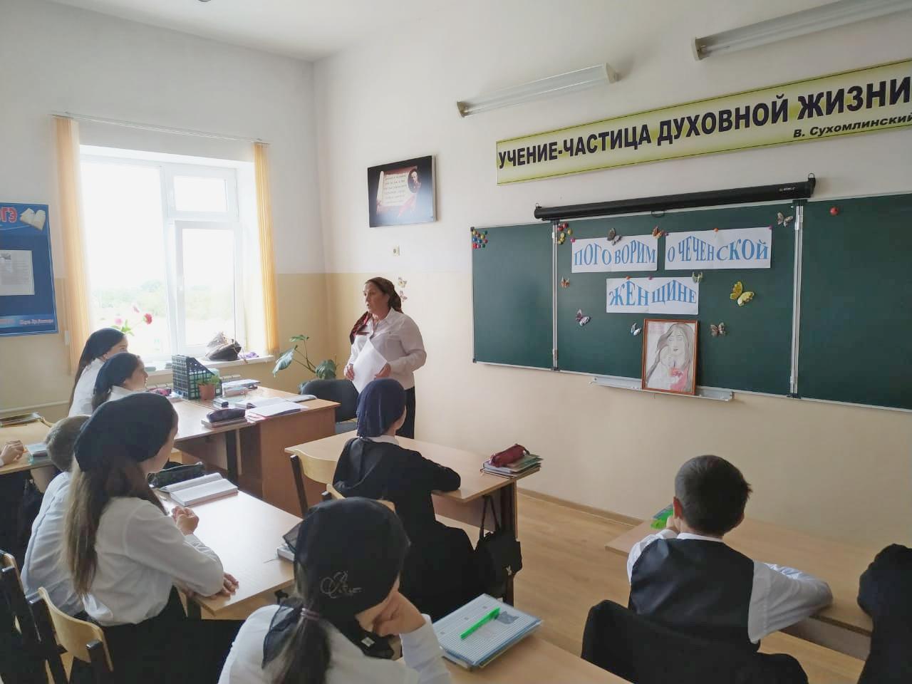 07.09.20197 сентября Магамадовой Р.С. проведен открытый урок, приуроченный к Дню чеченской женщины «Поговорим о чеченской женщине». На урок приглашены зам.дир по УВР Осаева Т.А., учитель чеченского языка и литературы Алиева З.З.. Прозвучало много стихов, теплых слов в адрес чеченских женщин.