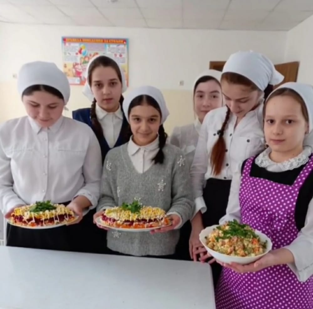 16.02.2021Учитель технологии Яхъяева Зарема А. учила наших девочек из 6 класса весьма полезному занятию. Под руководством учителя наши юные хозяюшки приготовили на уроке технологии овощной салат и салат оливье. У нас только один вопрос: кто съел всю эту красоту?? 😀😛