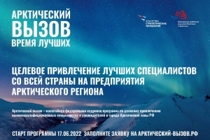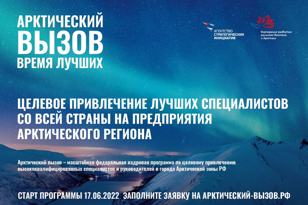 20.07.2022«Арктический вызов» ждет своих участников 17 июня начался прием заявок на участие в самой масштабной федеральной программепо привлечению высококвалифицированных кадров в арктическую зону – «Арктическийвызов».«Арктический вызов» – совместный проект Корпорации развития Дальнего Востока иАрктики(КРДВ)иАгентствастратегическихинициатив(АСИ)приподдержкеМинвостокразвития России и Союза Живые города.Арктическаязона–развивающийсярегионРоссиисбольшимколичествоминновационных проектов и программ, открывающих возможности для 50 000 рабочихмест в будущем. «Арктический вызов» сейчас – это программа быстрого привлечениявысококвалифицированных специалистов и руководителей из всех субъектов России наруководящие вакансии в правительствах и на ведущих предприятиях 9 регионов Арктики.Прием заявок осуществляется на сайте арктический-вызов.рф по 9 направлениям: