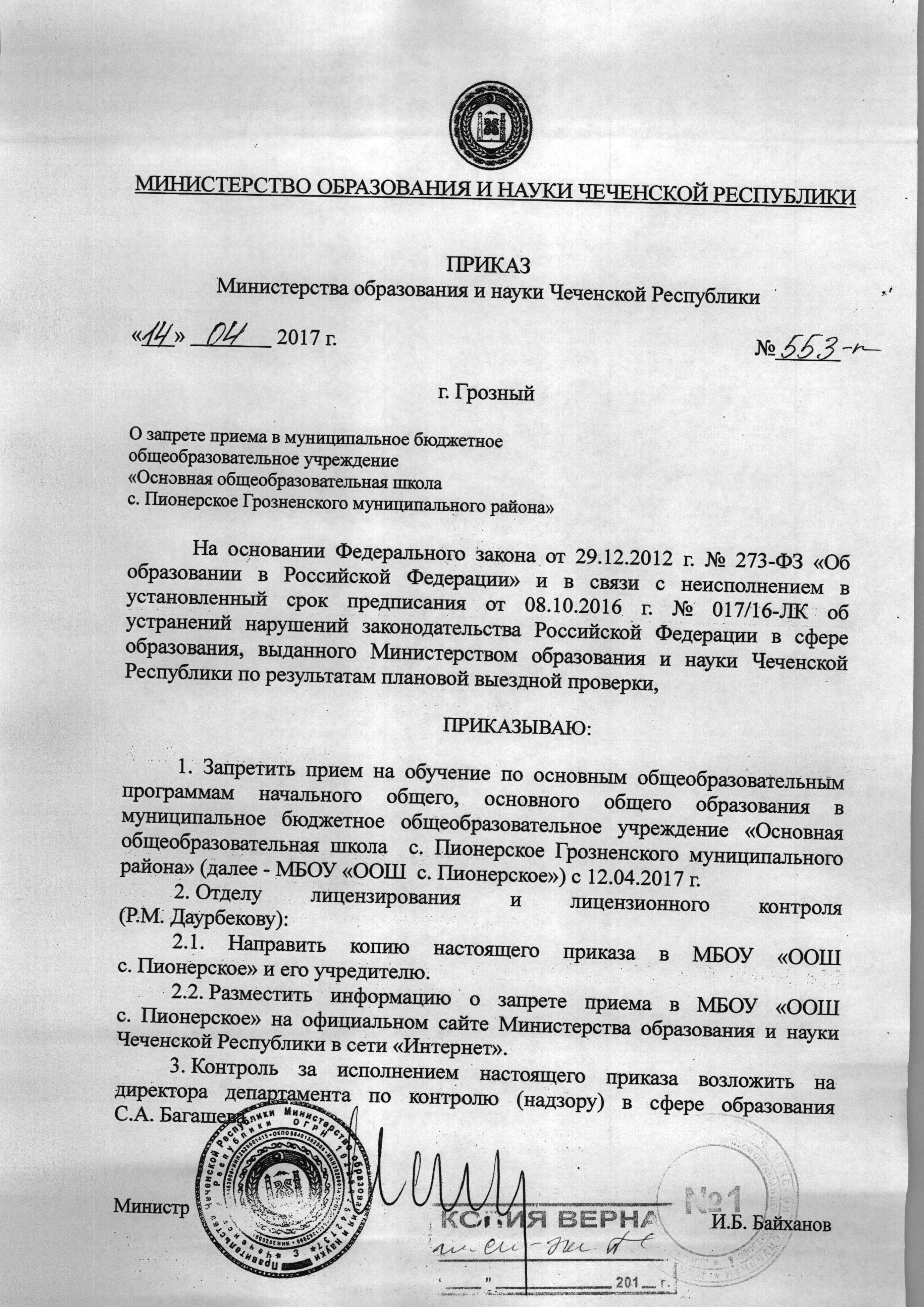 О запрете приема в муниципальное бюджетное общеобразовательное учреждение "Основная общеобразовательная школа с.Пионерское Грозненского муниципального района"