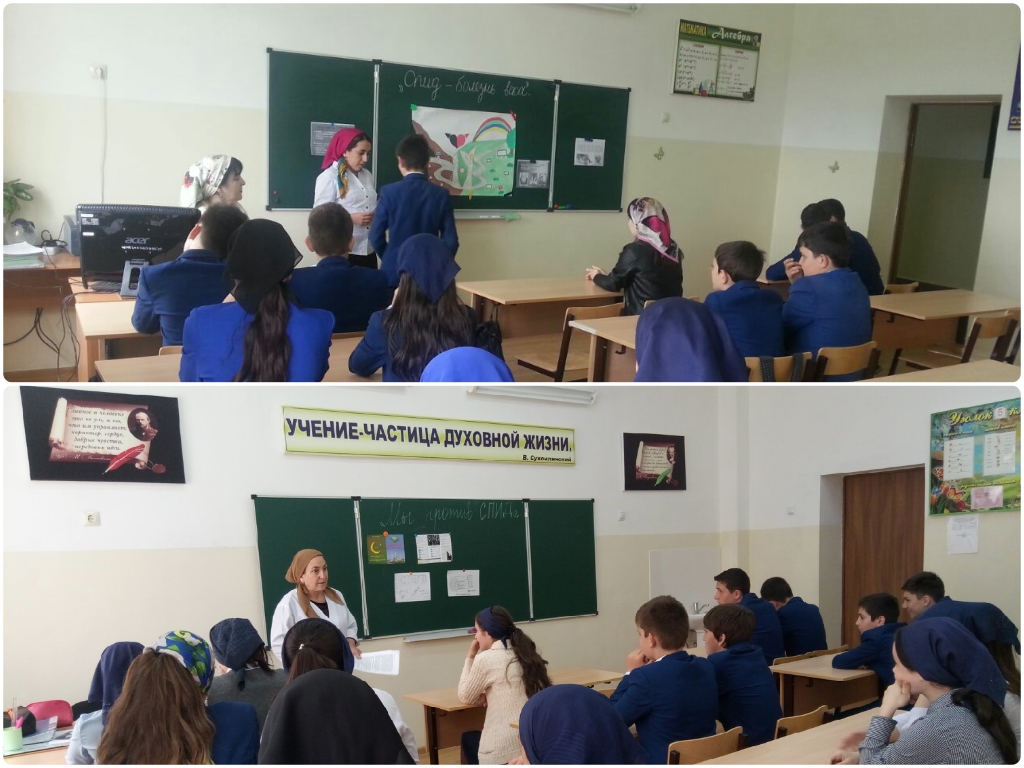 С учащимися 8-9 классов провела беседу на тему «Мы против СПИДа» школьная медсестра Яндарханова А.В.. Она рассказала о путях передачи ВИЧ;
