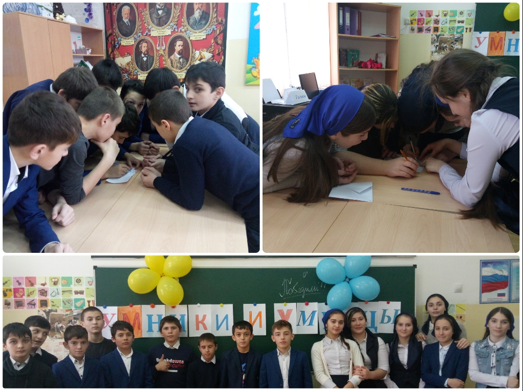 29.01.201829 января с учащимися 7-8 классов проведена игра «Умники и умницы». Подготовила и провела интеллектуальную игру «Умники» и «Умницы» учитель русского языка Магамадова Р.С. Игра проведена в рамках месячника по военно-патриотическому воспитанию.