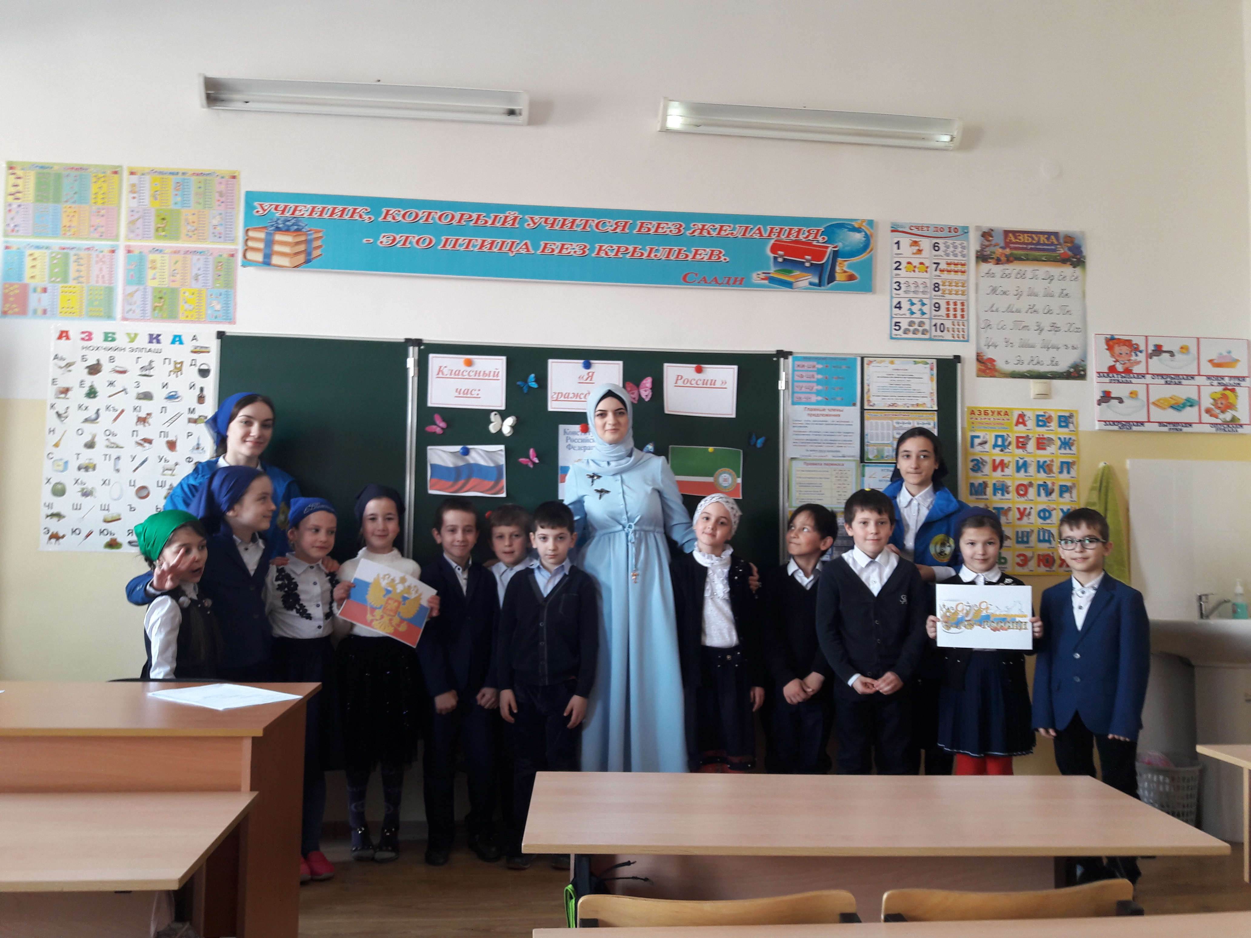 11.03.201911 марта проведено мероприятие во 2 классе «Я гражданин России». На классном часе присутствовали члены отряда «Юные Кадыровцы». Они проводили лексическую работу, так как многие термины, связанные с этим праздником, малышам незнакомы. Затем дети послушали рассказ учителя по теме «Быть гражданином». Проведена работа с пословицами о Родине, повторили символику.