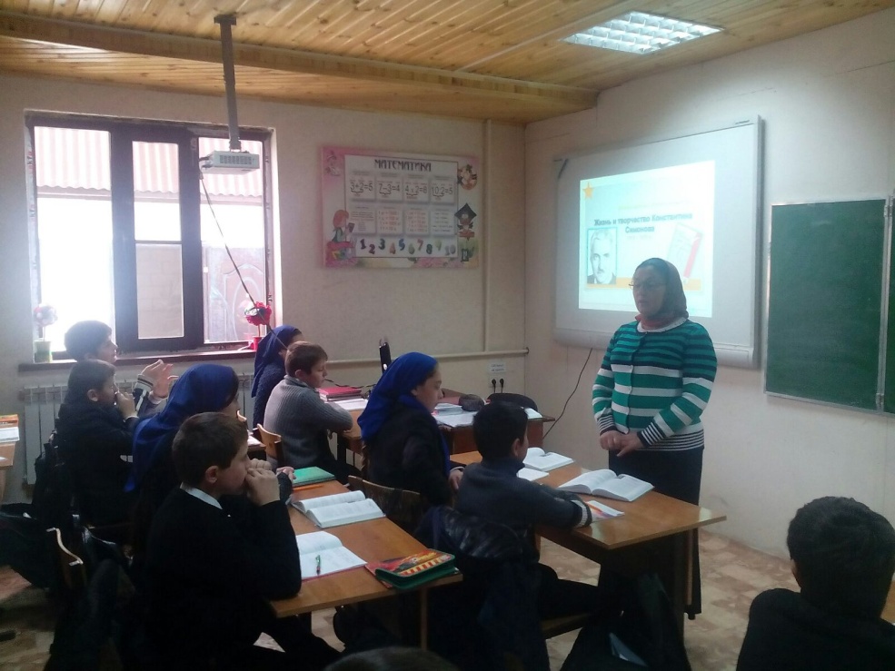 Был организован просмотр документальных видеоматериалов. Прошел тематический урок в 3 классе «Константин Михайлович Симонов-поэт военных лет». Стихотворения К.М. «Жди меня и я вернусь» прочитал ученик Кадиев А.
